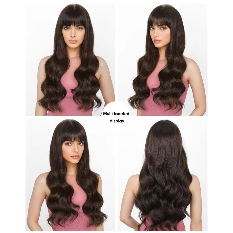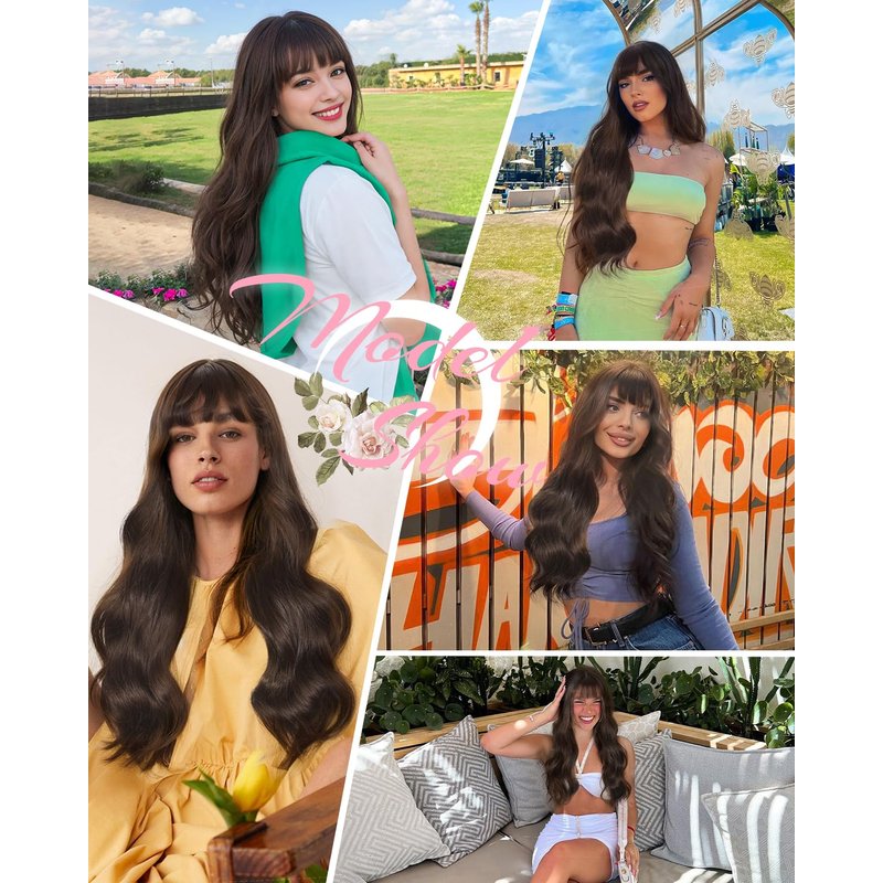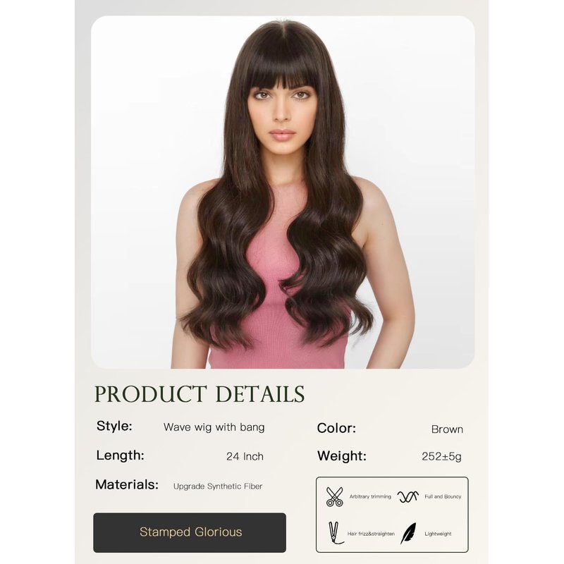 Stamped Glorious Brown Wig with Bangs for Women Long Wavy Curly Wigs Synthetic Hair Wig for Girls Party Daily Use