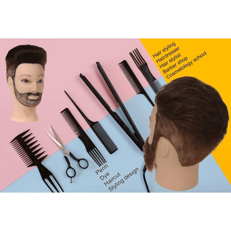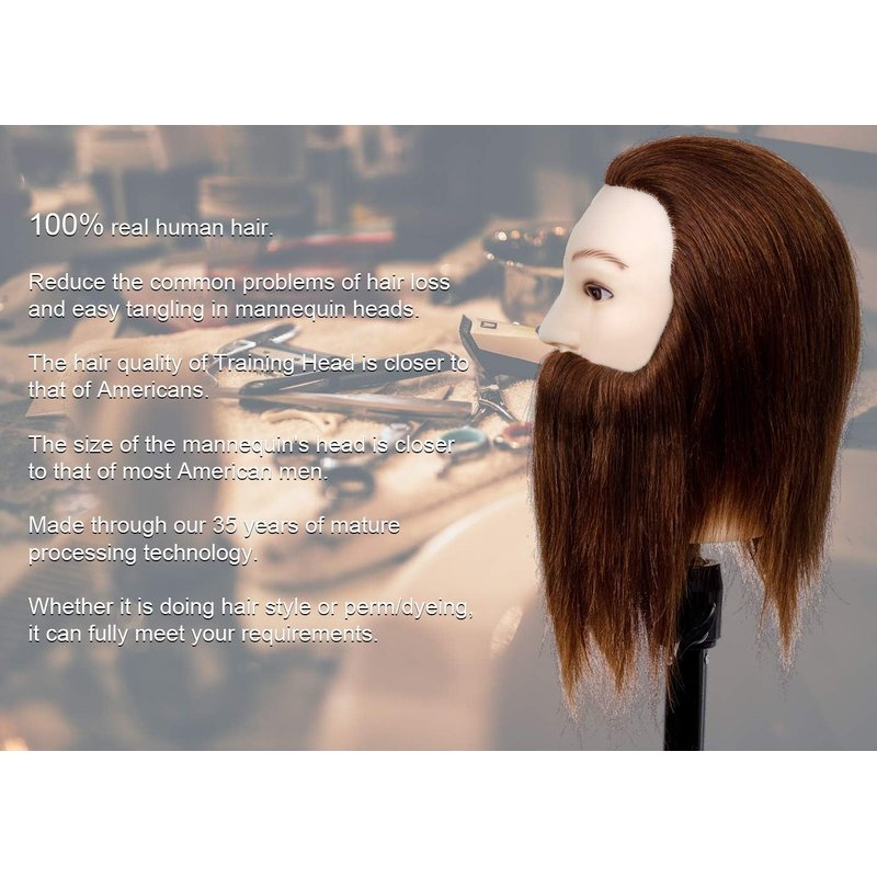 - Male mannequin head material: hair and beard is 100% human hair and skin is PVC; color:#4 dark brown. The processing technology is mature, and each mannequin head has been strictly washed and disinfected.