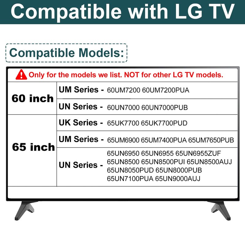 - --Compatibility-- TV Stand Legs for LG TV stand 60UM7200 60UM7200PUA 60UN7000 60UN7000PUB 65UK7700 65UK7700PUD 65UM6900 65UM7400PUA 65UM7650PUB 65UN6950 65UN6955 65UN6955ZUF 65UN8500 65UN8500PUI 65UN8500AUJ 65UN8050PUD 65UN8000PUB 65UN7100PUA 65UN9000AUJ. Part number: MAM643875. (⚠ Important Notes: NOT universal TV legs. NOT for other LG TV models. Only for the models we list.)