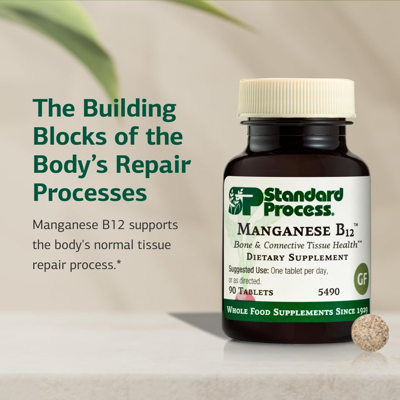 Support your health through whole food-based nutrition with Standard Process Manganese B12. Manganese B12 contains manganese and vitamin B12 to support enzymatic functions* and bone health.* To support tissue repair, this dietary supplement supports the body's normal tissue repair process* and supports healthy connective tissue.* The supplement is an excellent source of manganese, copper, and vitamin B12 to support body health. As a daily vitamin, it is also a good source of zinc and antioxidant vitamin C. Manganese is a blood health supplement that supports normal red blood cell function* and supports hemoglobin formation.* For best results, adults take one tablet per day, or as directed by your healthcare professional. This supplement is gluten-free, non-dairy, and non-soy to meet different dietary needs and restrictions. Standard Process is a multi-generation nutritional supplement company dedicated to formulating whole food-based supplements. We prioritize quality and testing at every step through a vertically integrated process, ensuring our nutritional supplements support you. For more than 95 years, Standard Process has been changing lives with nutrient-dense, whole food-based supplements for the entire family—even pets. We combine naturally sourced ingredients, many of which are grown on our certified organic farm, with clinically inspired innovation from the Standard Process Nutrition Innovation Center. It’s how we harness nature’s energy to ensure that our products can enhance wellness.