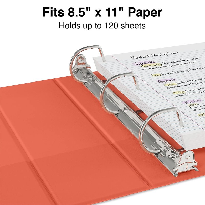 Customize your binder cover with this Staples Standard 120-sheet-capacity 1/2-inch D-ring orange view binder. Secure loose pages with this Staples Standard view binder. The nonstick, archive-safe material doesn't lift ink or toner from printed pages to keep them looking clean and professional, while the 1/2-inch D-rings let you store up to 120 sheets. This Staples Standard view binder is made with PVC-free plastic, which contains fewer harmful chemicals, making it an eco-friendly choice. Orange view binder is an excellent choice for storing spreadsheets and other wide papers. Three D-rings keep pages secure. Holds up to 120 sheets. Wide design accommodates letter-sized papers. Durable covers are made of plastic with nonstick surface. Two interior pockets for added organization. Insert a custom spine label for easy identification.