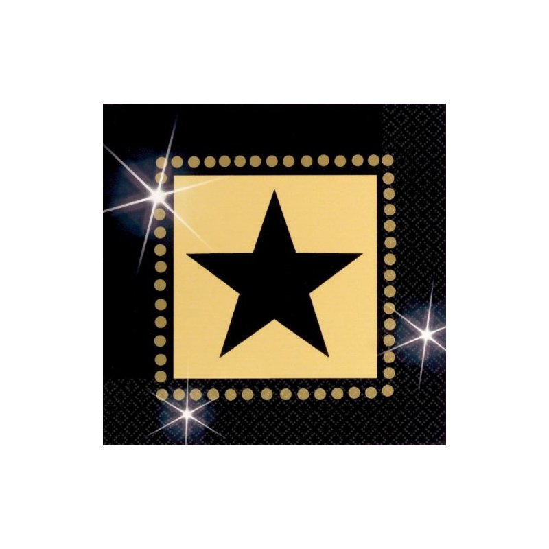 These dessert napkins go hand-in-hand on the red carpet with your best black tie. Each package contains 16 3-ply napkins measuring 5" x 5" when folded and featuring a black star in a gold field surrounded by a black border with gold dots.