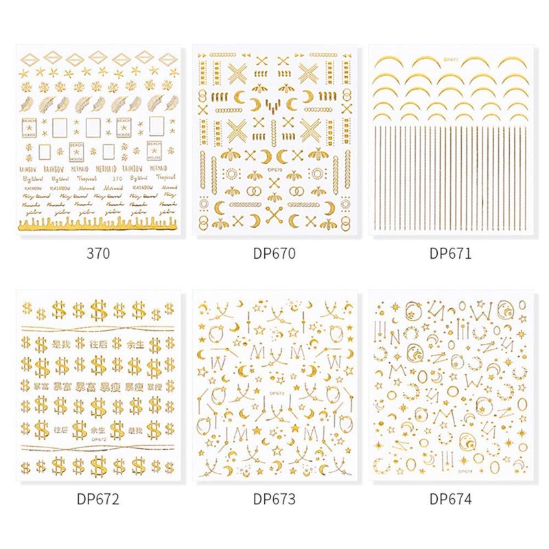 Package Contents: 6 Sheets 3D Laser Gold Nail Art Stickers