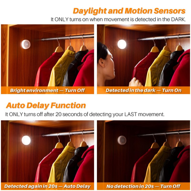 - ☀【MOTION SENSOR & LIGHT SENSOR】 With passive infrared technology (PIR), it detects human motion. Automatically turns on in the dark. The motion sensor closet lights is auto-on within 16 feet, auto-off after 20 seconds with no motion. To save battery life, these smart lights won't turn on if there's already light in the area.
