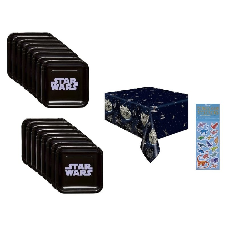 Star Wars Classic Birthday Party Supplies Bundle Pack includes 16 Paper Plates, 1 Plastic Table Cover, 1 Dinosaur Sticker Sheet (Bundle for 16)