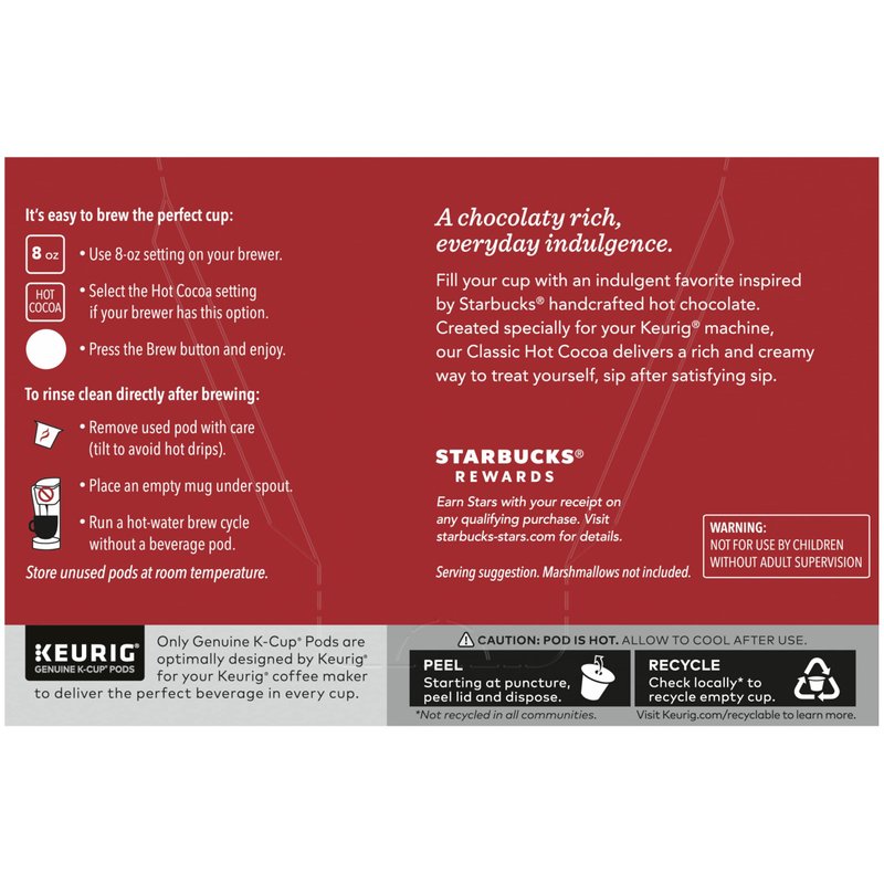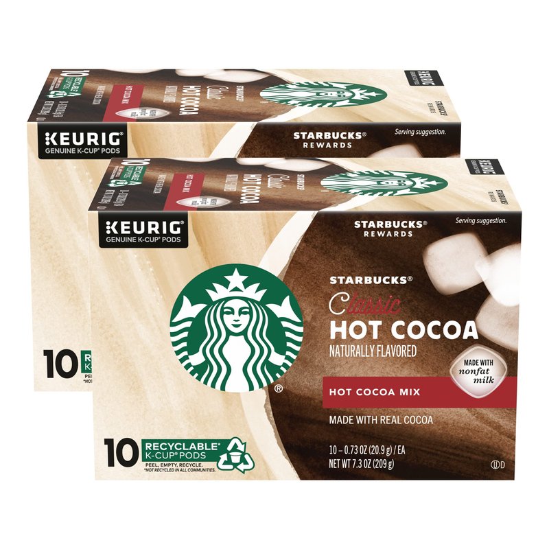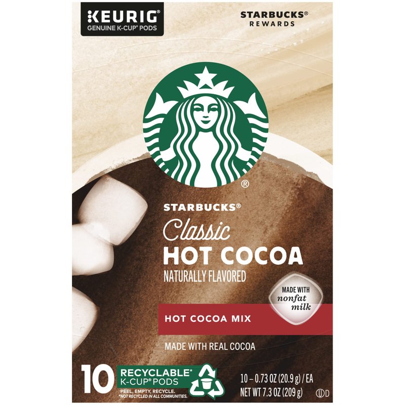Starbucks Classic Hot Cocoa Mix rich and creamy specialty beverage, made with real cocoa and nonfat milk. A cozy cup of cocoa makes for a rich and delectable treat for the holidays, wintertime or anytime! An indulgent favorite inspired by Starbucks handcrafted hot chocolate. Created specifically for your Keurig machine, our Classic Hot Cocoa delivers a rich and creamy way to treat yourself, sip after satisfying sip. From K-Cup to the Perfect Cup: It's easy to brew the perfect cup at home with your favorite Starbucks K-Cup pods. You'll discover a variety of blends to fit your mood, the season or the tastes of gathered guests. Adding a touch of inspiration like milk, cream, syrup or a variety of other customizations lets you put a personal twist on your favorite Starbucks brew. How to Brew: Use 8-ounce setting on your brewer; Select the Hot Cocoa setting if your brewer has this option; Press the brew button and enjoy! Each box contains 10 recyclable K-Cup Pods of Starbucks Classic Hot Cocoa Mix.