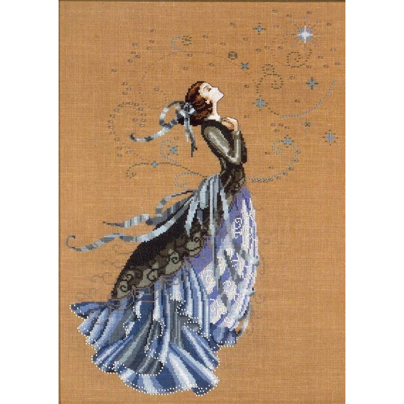 White glowing stars reflect over a gown of satin ribbons and brocade. The dress is stitched in soft greys and dusty blues and covered in swirling starry beads. As the lady watches the sky filled with luminous diamonds she wishes upon them all. Dreams placed on a star really can come true. Model stitched on 28ct. Country French Cappucino linen using DMC floss. Stitch count: 190w x 275h.
