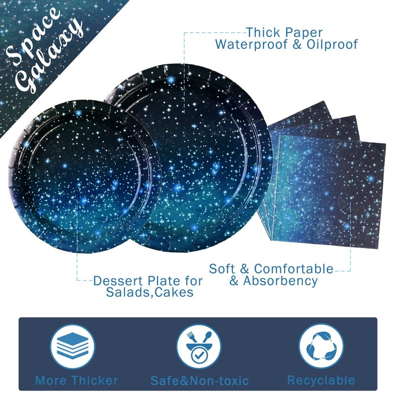 - 2.【Vibrant Space Party Design】:This galaxy theme party tableware set is all designed in blue starry sky theme pattern,full of starry sky theme party atmosphere,which is clear and exquisite,and can match well with your party ornaments,making your home and party more beautiful and attractive,creating a dreamy starry sky atmosphere