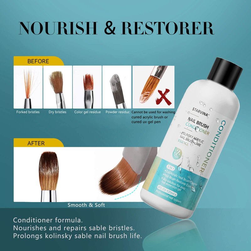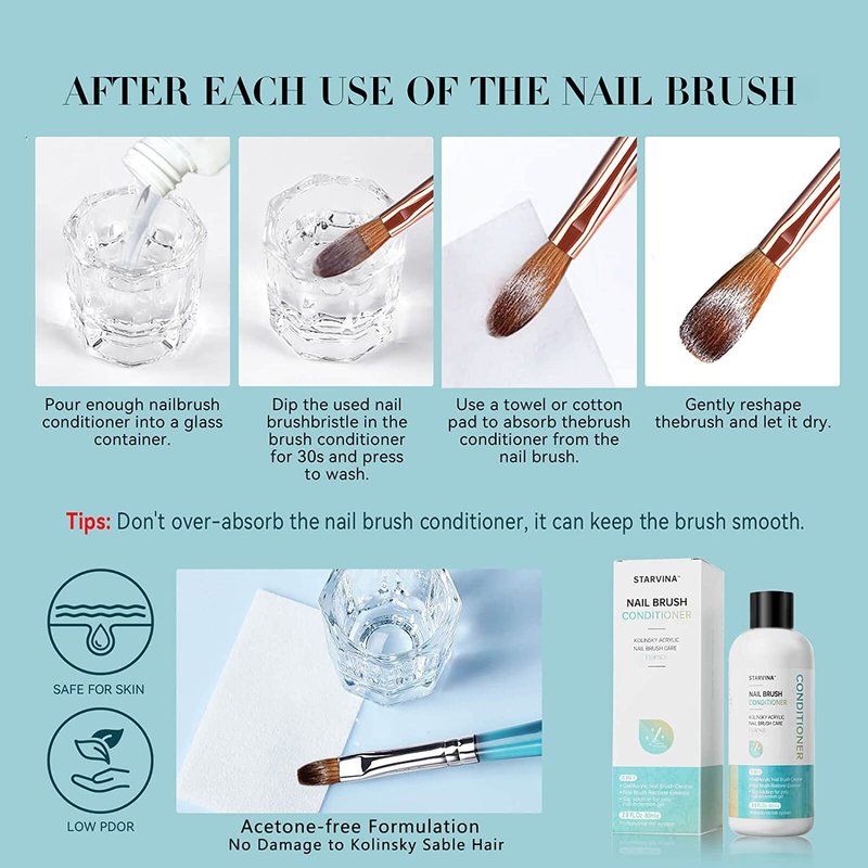 - WARNING: STARVINA Professional Nail Brush Essence Solution is designed to keep your nail brushes looking good for a long time. Note, after using the nail brush manicure, pls use the nail brush conditioner essence treatment immediately, 3-5 mins to complete, to avoid wasting a long time soaking the nail brush, if you have any questions, please contact us for help.