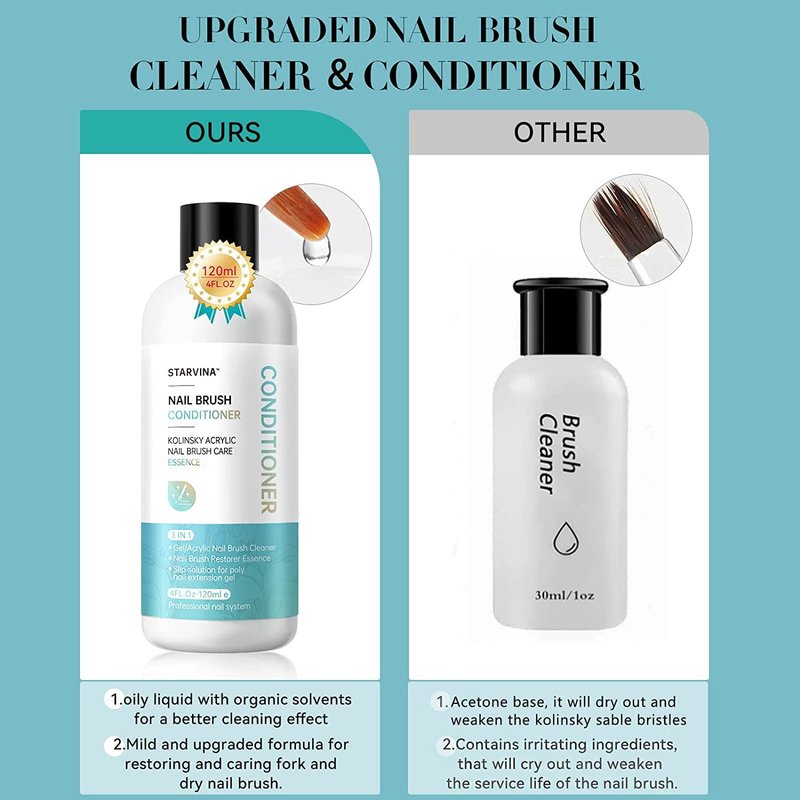 - Upgraded Nail Brush Cleaner Essence: STARVINA Nail Brush Cleaner contains acetone-free formula organic dissolvers that quickly effectively clean new brushes sealing wax and any colored gel/powder/ residue from nail art brushes, so it won't weaken and damage your brushes like traditional acetone cleaners, it can protect your Kolinsky sable acrylic nail art brushes in time to save you more money.