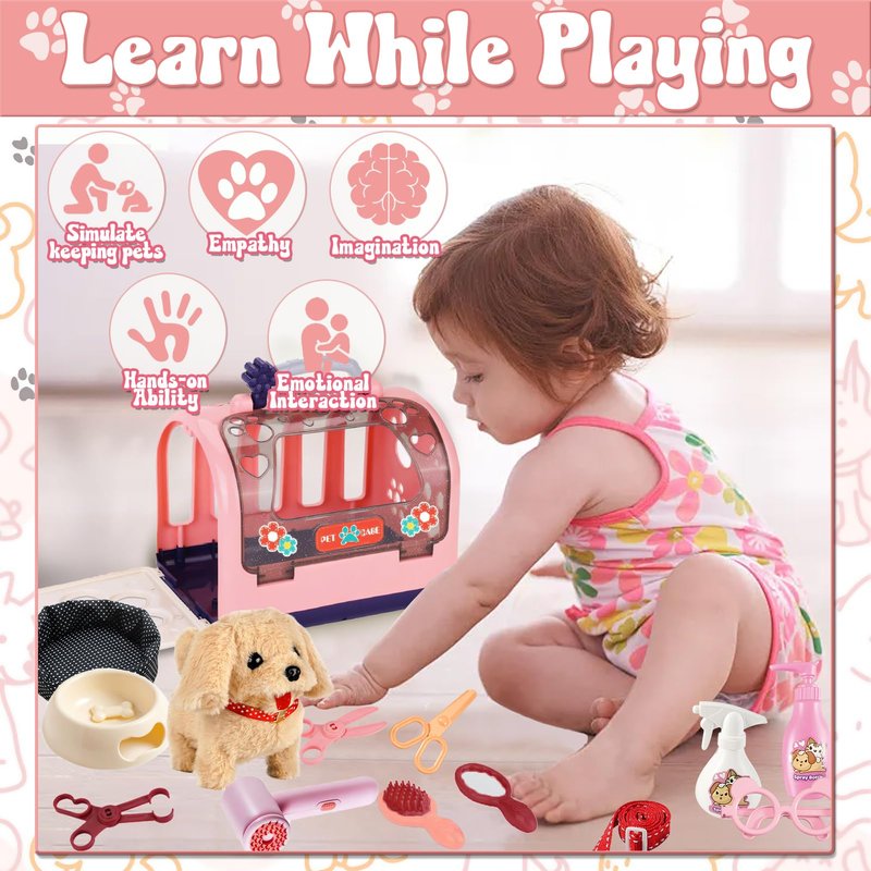 STAY GENT Stuffed Dog Robot Toy for Kids, 16Pcs Interactive Pet Care Toys with Pet Cage & Walking Dog Toy with Leash, Electronic Dog Grooming Toys Pretend Play Gifts for Girls 3 4 5 6 Years Old