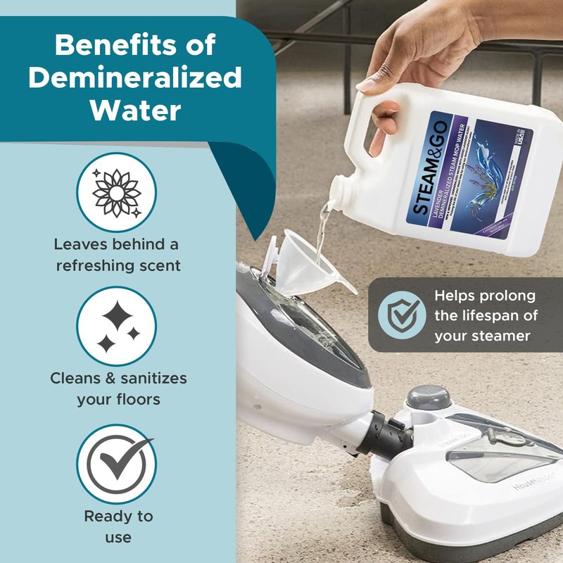 - POWERHOUSE MOPPING SOLUTION - Maximize the filtration of your steam machine. Use Steam & Go’s demineralized water multi-surface cleaner. Our floor cleaning solution removes spills, dirt, and other residues to keep your floor smelling and looking clean.
