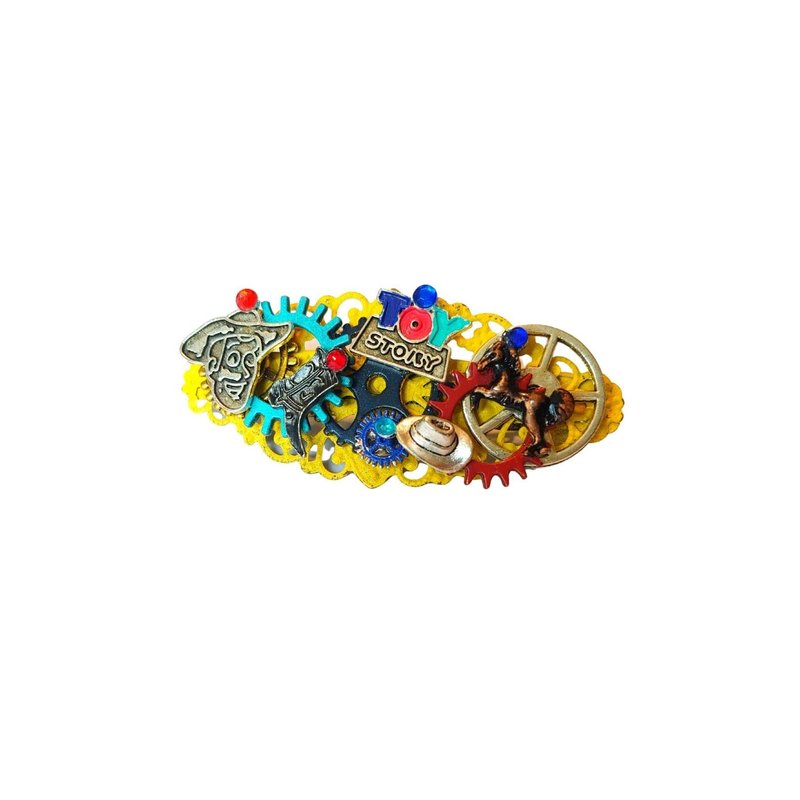 Steampunk Story about Toys hair clip barrette. Yellow base with Cowboy Wood, horse, Movie sign and more on top of metal gears in red, blue and brass. Brass clip is 3 inches long with a french clip. IF you are interested in a CUSTOM hair clip on another theme, please just ask!!