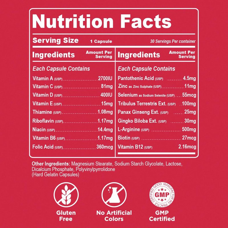 - Features a potent blend of L-Arginine, Tribulus Terrestris Extract, Vitamin A, Vitamin C, Ginkgo Biloba Extract, and Panax Ginseng Extract for a balanced formulation