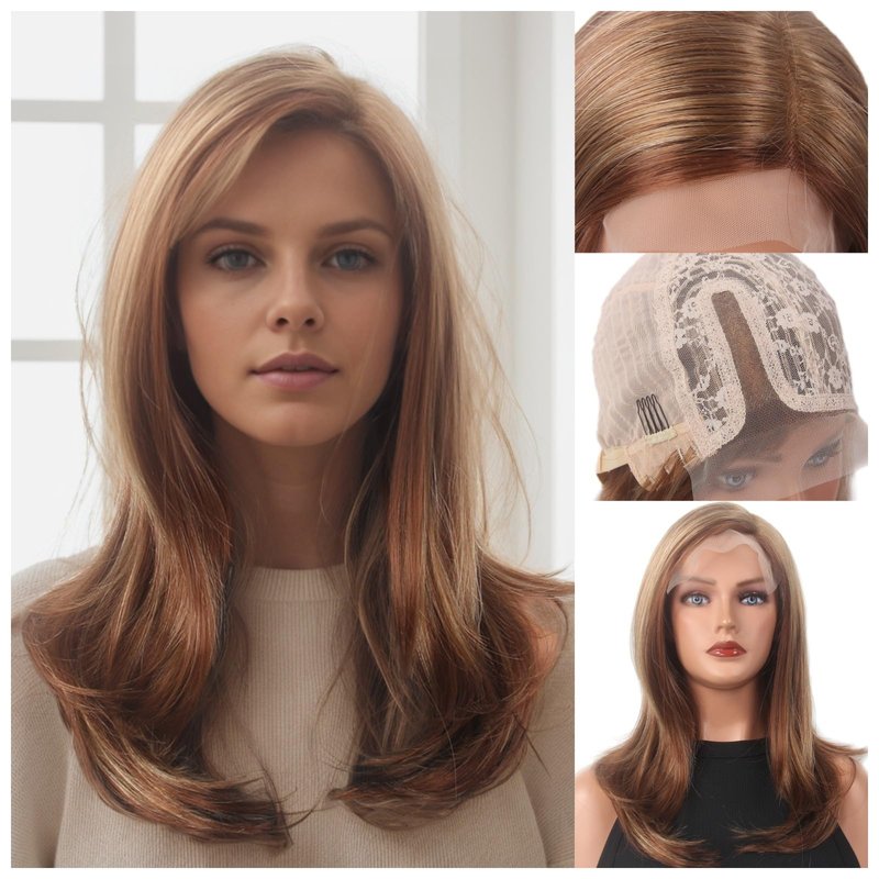 • Middle Length T-part Lace Wigs:The brown highlight front lace synthetic wig are use Kanekalon flame redardant fiber, very soft and light, natural like your own hair,very safe.