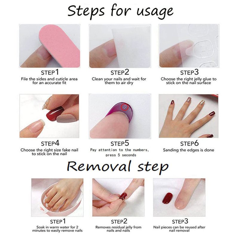 - 【Reuse】If you use jelly adhesive nails tabs to fix false nails, it can be easily removed without affecting the nails for repeated use (sustainable for about 3 days), if you want to keep it for a longer time, you need to use nail glue.