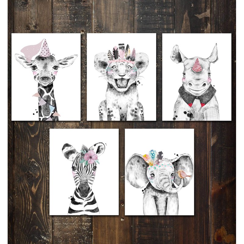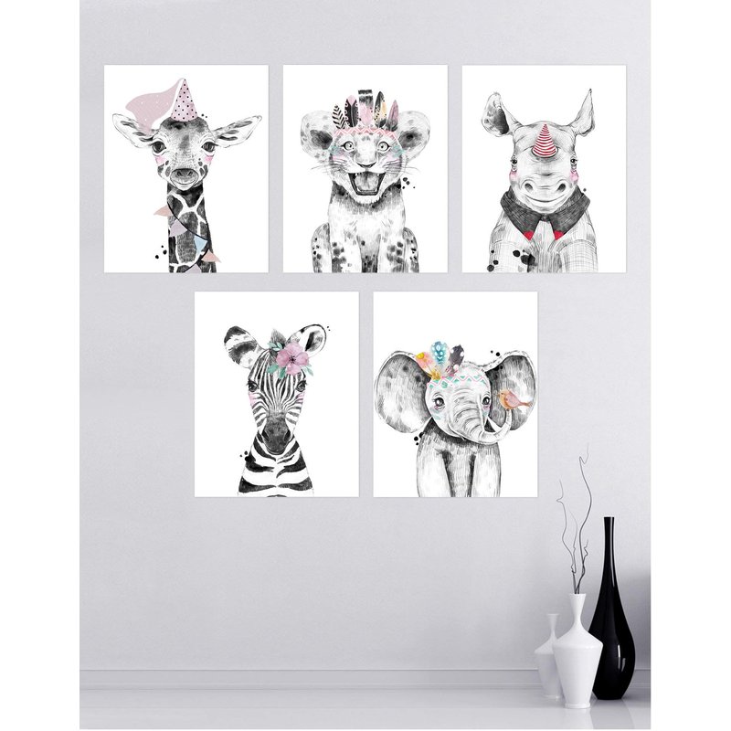 - These cute baby animal prints will bring joy to to everyone in the room. Sweet dreams will follow. Beautiful colorful prints of 5 baby animals. Watercolor illustration drawing of Elephant, Giraffe, Rhino, Lion and Zebra. A creative way to add some colors to your Nursery or Bathroom. (Black, White, Pink, Red, Orange, Light Green, Grey and Purple)