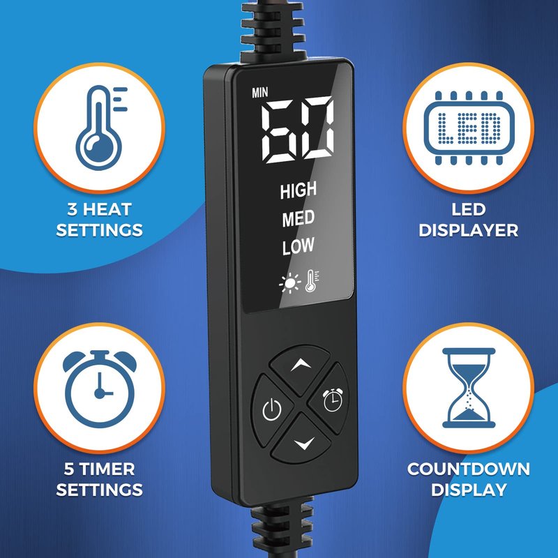 - SAFE FOR DAILY USE: the heating pad is powered by provided 12V adapter which is safe voltage for human beings, and the LED Display hand Controller with total 9.5 ft Extra Long power cord (NOT FOR PORTABLE USE) allows you to much flexibility in the room. Our Heating pad choose fiber Heating Element and embedded with thermostat sensor, which is more durable and safer for daily use.