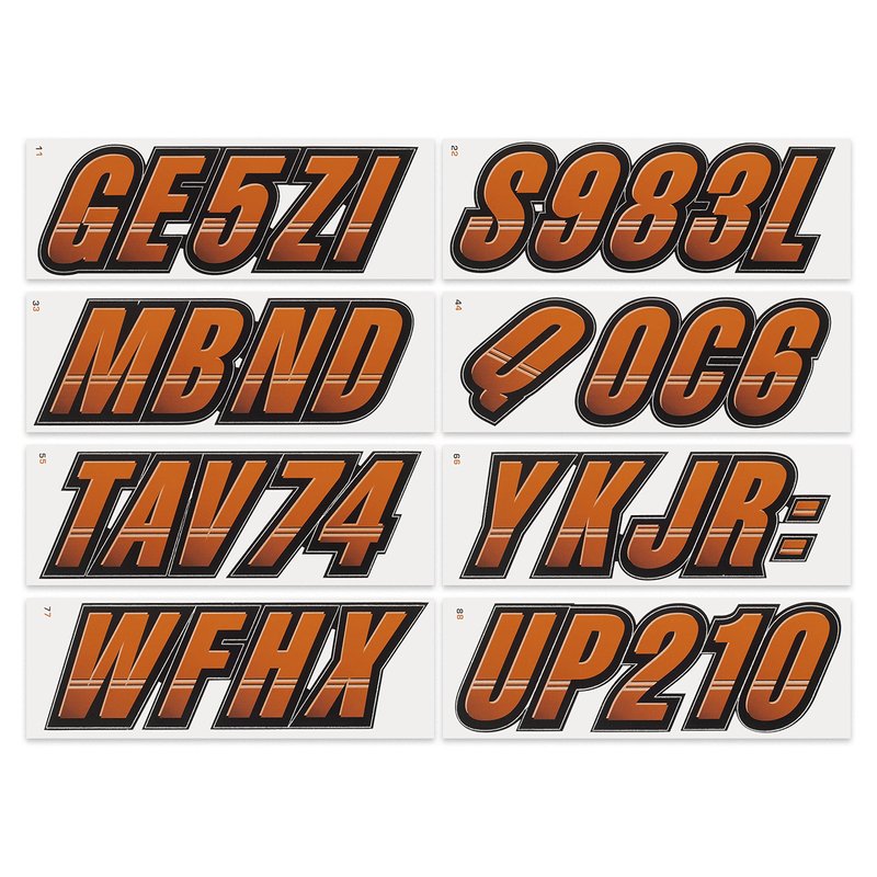 The STIFFIE Techtron Alpha Numeric Identification Kit has filled the void for a racing inspired registration decal. This style is a two-color design that features a forward facing slant with an exterior color fade-in, graduating from the bottom upward. Its circle track/auto racing inspired form is the basis of the individual characters. All characters are set off by an interior half toned highlight, providing a 3 dimensional look. Additionally, the Techtron design features two interior accent stripes that look like they were carved into the face of the interior character. This design is topped off with a heavy, wide body exterior outline. This makes overlapping the individual characters very easy, enabling you to create a unified, custom look like never before. Who said your registration decals have to be boring? If you are looking for an aggressive, speed inspired style in addition to functionality then this style is probably for you. STIFFIE decals are made to match your OEM Boat, Marine Vessel or Personal Watercraft using our COLOR CLONE print system.