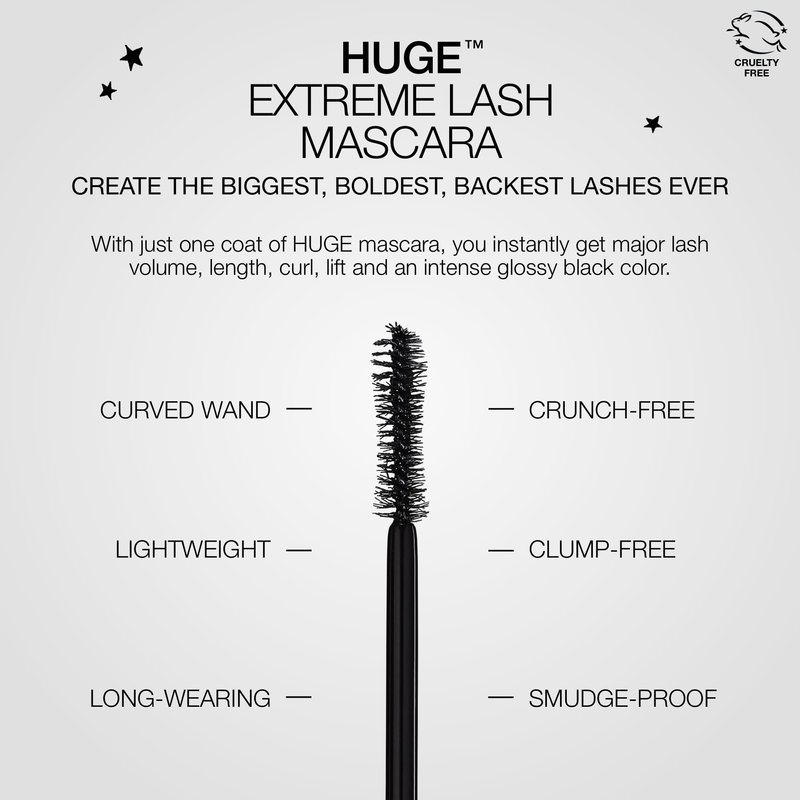 - MAXIMIZE VOLUME: With just one coat of HUGE mascara, you instantly get major lash volume, length, curl, lift and an intense glossy black color. No need for falsies, fake lashes, mascara primer or fiber mascara. An eyelash mascara for the biggest, boldest, blackest black lashes ever.