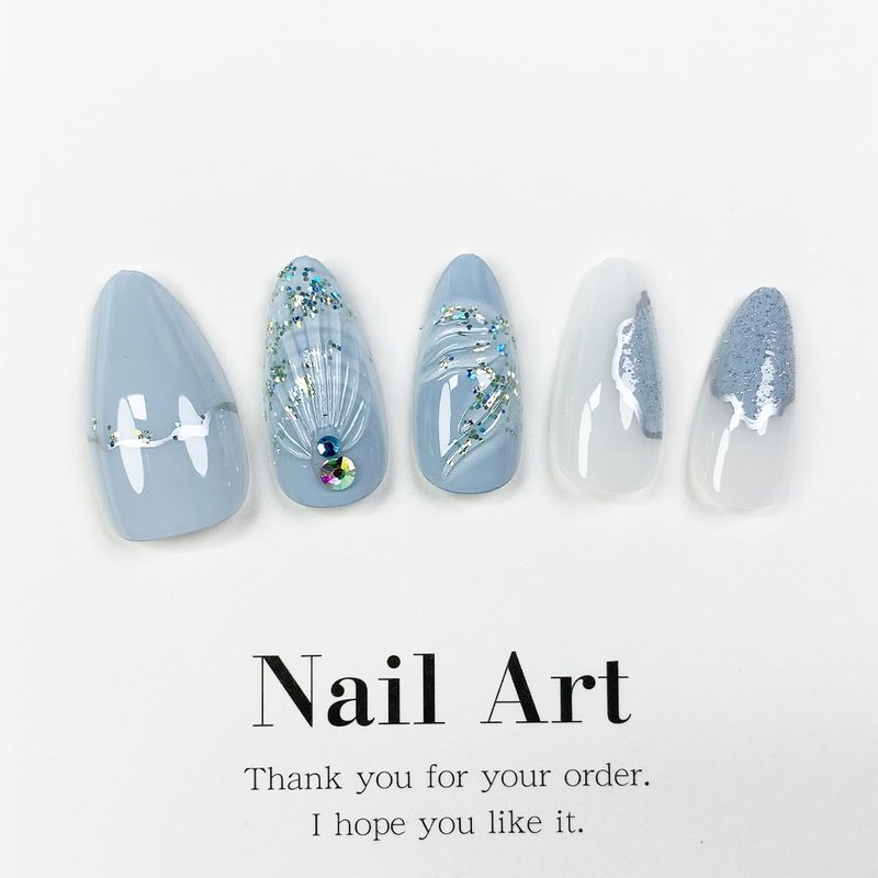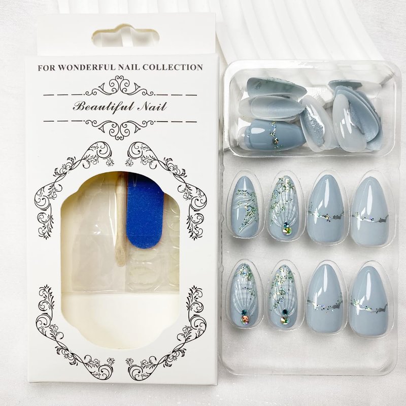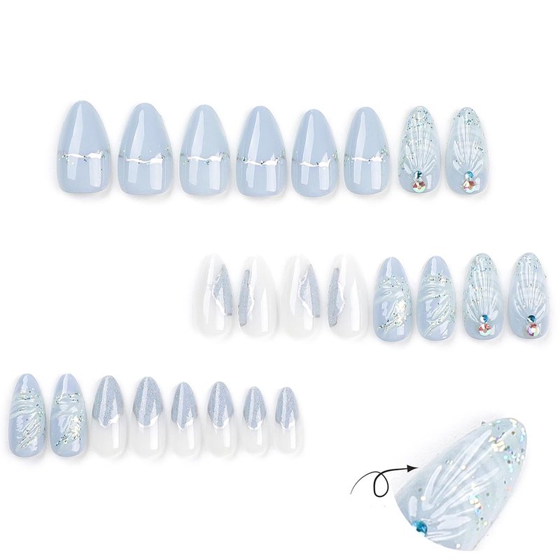 Stiletto Press on Nails Long Almond Fake Nails Summer False Nails with Design 3D Shell Glitter Full Cover Glossy Stick on Nails Rhinestones Glue on Nails Ocean Acrylic Artificial Nails for Women 24Pcs