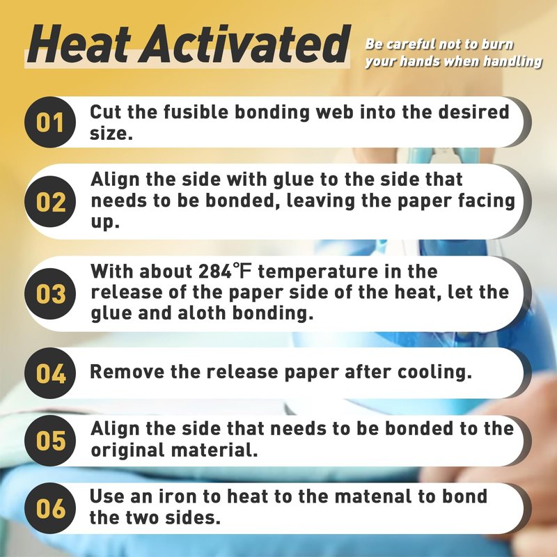 - HIGH-QUALITY MATERIAL: The fusible Web is made from 100% thermoplastic adhesive polymer resin, ensuring durability, sturdiness, and eco-friendliness. It is similar to non-woven fabric at normal temperature, but it melts and becomes sticky at high temperature (275-320F). It handles well, is sheer and doesn't add bulk to your fused piece and bonds firmly once cooled.