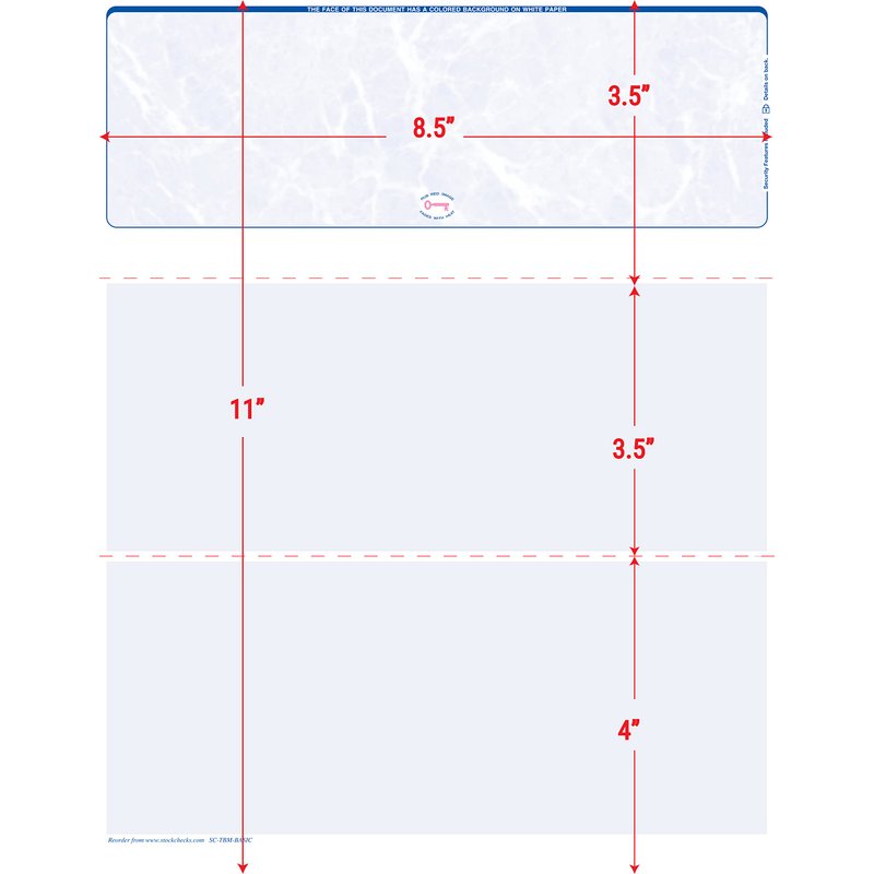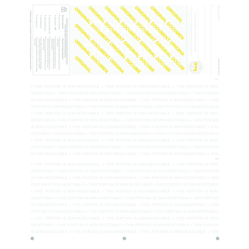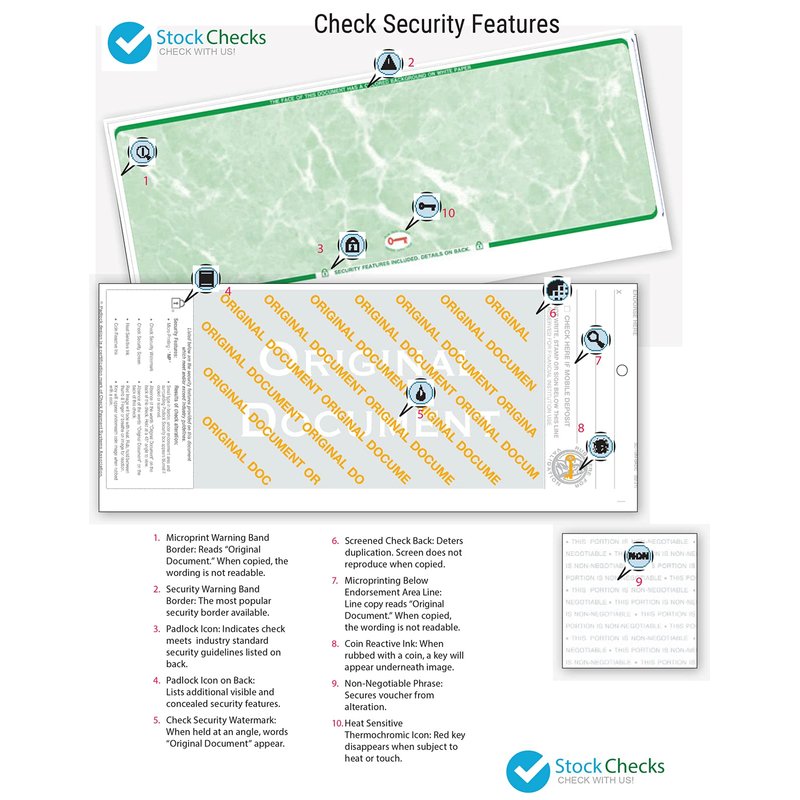 10 Security Features. Quantities: Start at 250 checks. Size: 8½" x 11". Border: Microprint warning band with padlock icon. Perforation Positions: 3½˝ & 7˝ (top & center checks)). Paper: MOCR Bond Packaging: Polywrap protected. ANSI Compliant