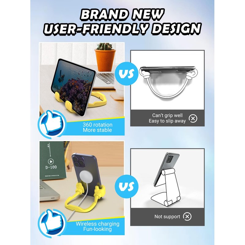 - Upgraded and Universal 360°Angle Adjustable Design: CALDEVER thumbs up cell phone stand holder features an innovative, upgraded design that allows for horizontal and vertical 360° angle adjustments, tailored to suit your personal viewing preferences. With widened and thickened structure, cell phone stand capable of accommodating a wide range of devices including smartphones, iPad minis, e-readers, Samsung and more devices