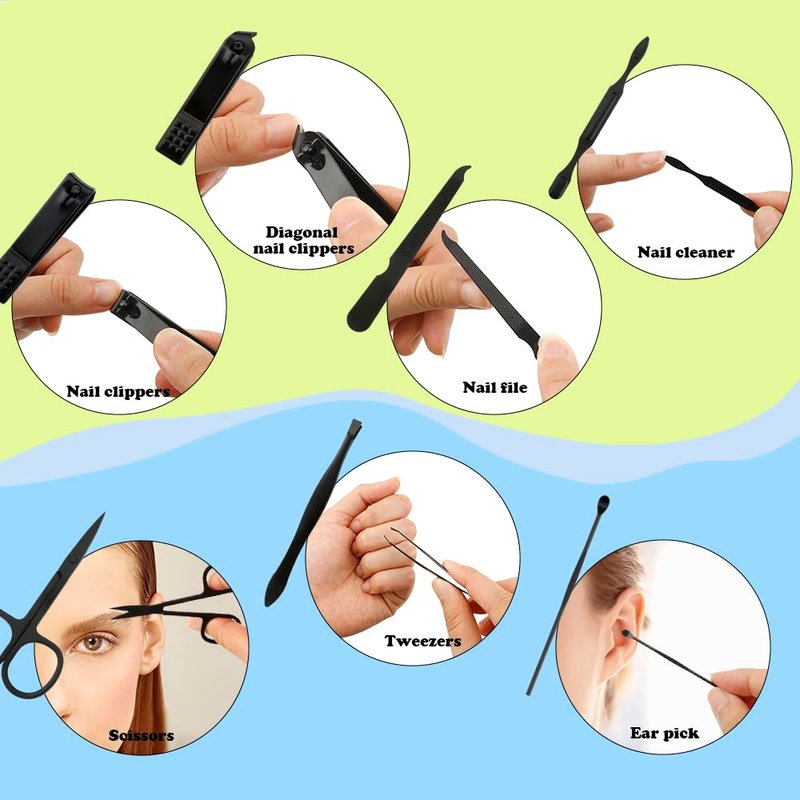 - 8 IN 1 PERSONAL CARE SET: This nail set with a leather case, contains 7 nail tools that can be used for hand care, foot care and facial care. Nail clipper, diagonal nail clipper, nail file, nail cleaner can be used for hand care and foot care. Scissors, tweezer, ear pick can be used for facial care. Multiple functions of personal care tools all in one case. You don't need to pay for any single nail tool! This 8-in-1 grooming kit fits your personal care needs perfectly. nail care