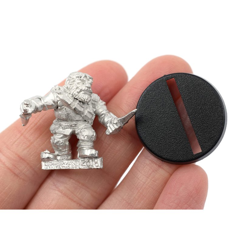 - 25mm diameter slotted round plastic base included. Made of 100% lead free pewter.