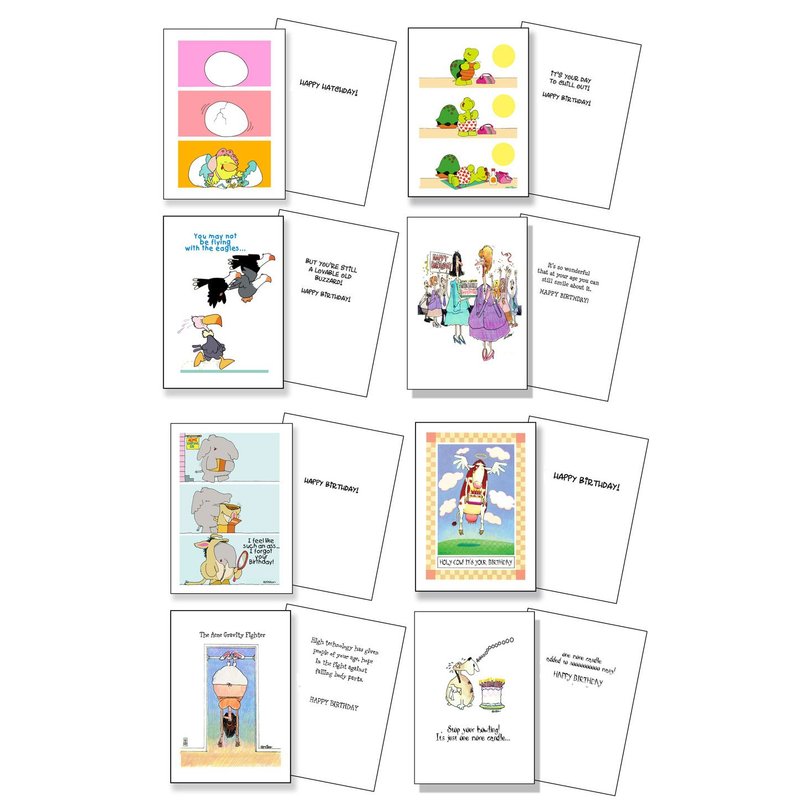 Assortment of humorous Birthday cards. One of each design. Printed on glossy card stock. Great assortment to have handy when you need a last minute Birthday card.