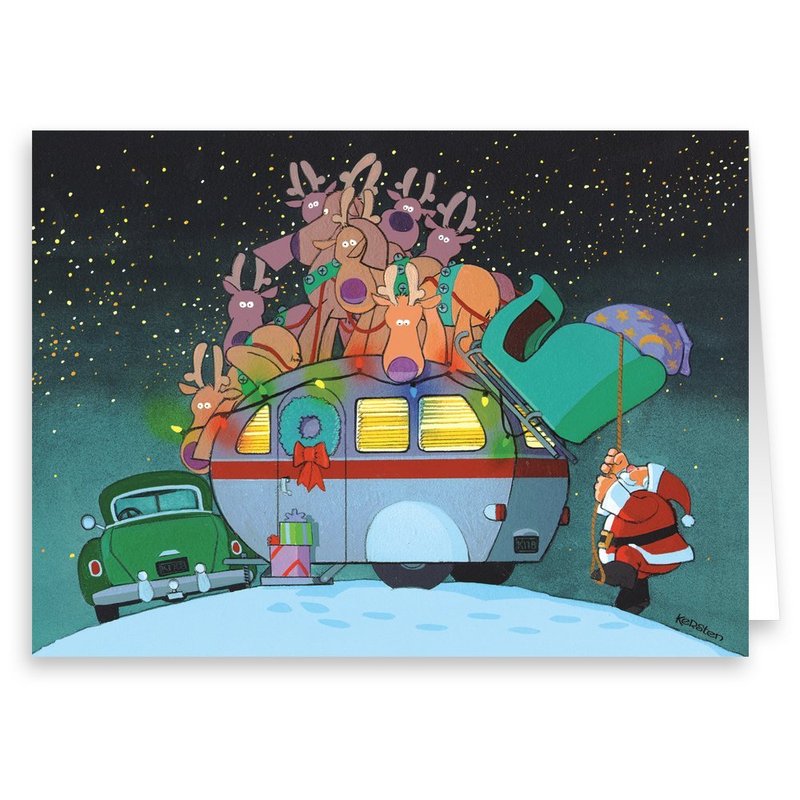 - These funny Santa lands on top of a classic camper cute Christmas cards are perfect to send to all your outdoorsy camping friends. It just goes to show, Santa can find you anywhere on Christmas Eve.
