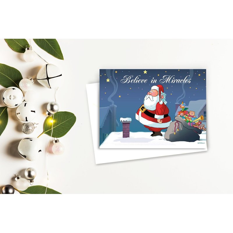 Stonehouse Collection Do You Believe in Miracles Christmas Card & Envelopes are an easy way to spread the joy of the holidays and share the love with your friends, family members, and coworkers. Give them a gift they can treasure for a long time. Our 5x7 folded Christmas greeting cards are made from quality material that won't get easily creased or folded. These holiday greeting cards have a glossy exterior finish, which makes the illustrations and graphics pop, while the non-glossy, matte interior of the card will allow you to write much more smoothly and easily without ink smudges. Our greeting cards feature a unique and funny design that will make your friends, family and loved ones smile from ear to ear. You can write a personalized message and make them feel special this holiday season. Send them these holiday cards with envelopes and make someone's holiday season a little more special with these unique and witty Christmas cards that are sure to put a smile on their face.