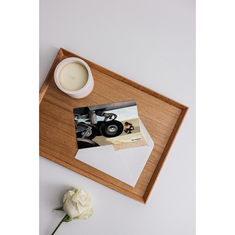 Pilot kicks the tires! Humorous aviation note card. Quantity: 10 note cards and envelopes. Size: 4 1/4 x 5 1/2 and has a blank interior