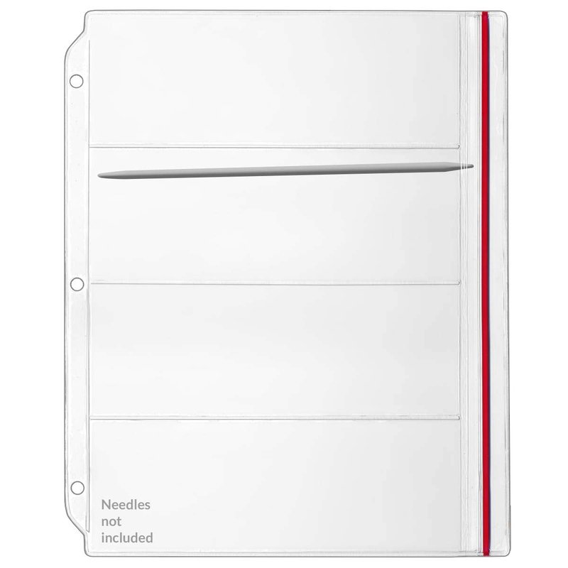 Anyone who knits knows the challenge of storing your tools! StoreSMART's Double Pointed Binder Pages are a fantastic solution for a tricky storage problem. Each 9 1/4" x 11 7/16" 6-gauge vinyl pocket is the perfect size to hold 4 sets of your Double Pointed Needles (up to 8" long). Secure your tools with the resealable zipper, and then store the pockets in any standard 3-ring binder. Instead of letting your supplies bend or snap in a drawer or box, keep them neat and organized on a shelf. There, now you have more mental energy for the never-ending yarn hunt! Note: Double Point Needles not included. Product Features: Crafted of crystal clear 6-gauge vinyl. Red resealable zipper keeps needles in, and dirt out. Includes holes for use with three-ring binders. Overall size: 9 1/4" x 11 7/16". Barred to created 4 pockets: Inside capacity of each pocket: 2 1/2" x 8". Proudly manufactured in the USA. Suggestions for Use: Organize your needles by size! Simply label each pocket with a marker or print-out label.