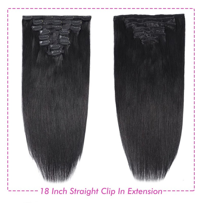 - Product Specification: 10A Straight human hair clip in extensions. Length: 10inch-26inch; Color: Natural Black. Weight: 135±5g. Brazilian human hair which is healthy and soft