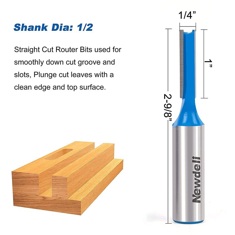- [Speicification] 3pcs 1/2 inch shank professional straight router bit set, Blade Material: YG6 carbide; Body Material: 45# carbon steel. Cutting Diameter:1/4",3/8", 1/2"; Cutting Depth(Approx.): 1",1",1".