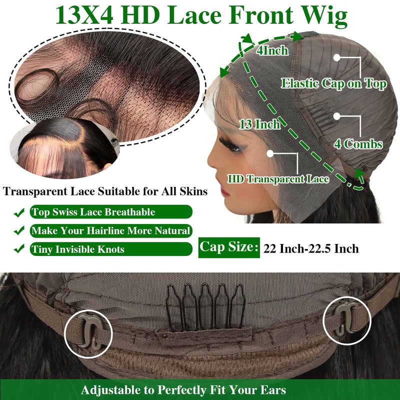 - Wig Cap Size: Straight glueless lace wig use medium cap size(19.5''- 22.5''), with 4 combs and adjustable straps, fit most people, easy to wear and install, durable, comfortable and breathable