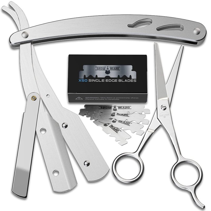 - COMPLETE KIT: We're committed to helping men put their best face forward, which is why this straight razor kit comes with everything you need with a professional grade single blade razor, 50 individually wrapped razor blades for men, as well as a pair of ultra-sharp beards and mustache scissors. Our straight razor shaving kit is the more brilliant choice for men who want to look their best.