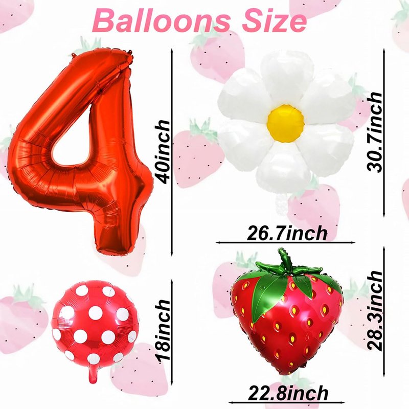 - 【Strawberry Balloons Set】Pack of 7 strawberry birthday decorations, include 40inch red number 4 balloons 1pcs, 26.7×30.7 inch daisy balloons 2 pcs, 22.8×28.3 inch strawberry balloon 2 pcs, 18 inch red round balloons 2 pcs. Everything you need to make the most exciting atmosphere in a complete strawberry party decorations.
