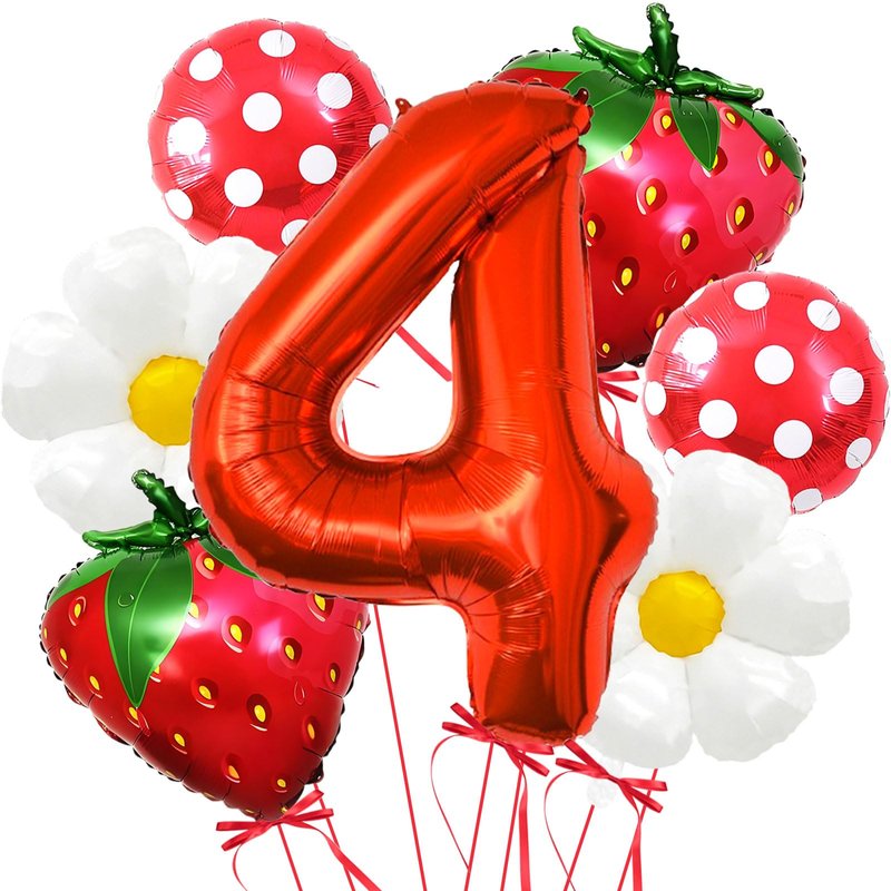 Pack of 7 strawberry birthday decorations, include 40inch red number 4 balloons 1pcs, 26.7×30.7 inch daisy balloons 2 pcs, 22.8×28.3 inch strawberry balloon 2 pcs, 18 inch red round balloons 2 pcs.