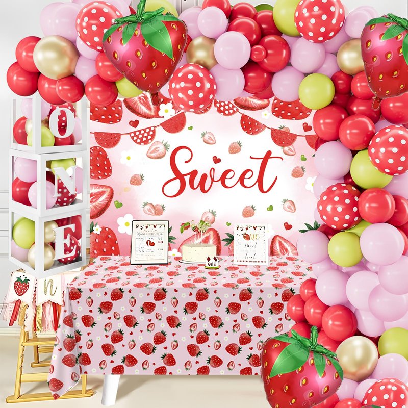 - SWEET STRAWBERRY PARTY DECORATIONS: Low on party prep time? Decorations too complicated? This strawberry party decoration kit can solve your problem! This decoration set includes 93pcs * balloons in different colours and sizes with assembly tools, 1pcs *sweet strawberry banner, 1pcs * strawberry disposable tablecloth, 3pcs * baby boxes with ‘one’ letter stickers. Let's make ‘party prep’ easy