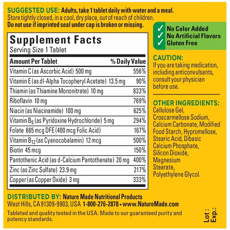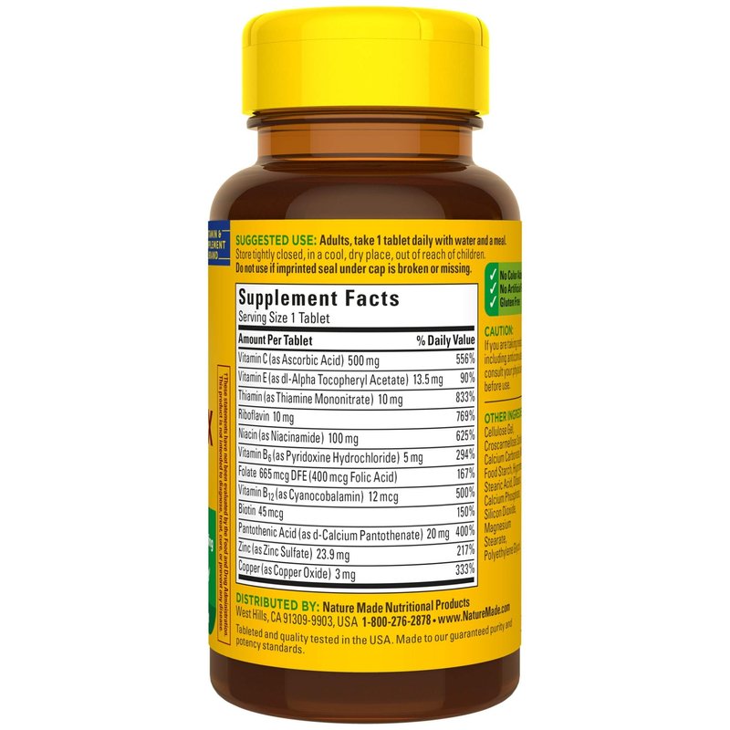 Nature Made Stress B Complex with Vitamin C and Zinc, Dietary Supplement for Immune Support, 75 Tablets, 75 Day Supply - Nature Made Stress B Complex with Vitamin C and Zinc is a dietary supplement designed to help support your immune system. Sourced from high-quality ingredients, this gluten-free stress supplement is made with no color added and no artificial flavors. This Vitamin B-complex supplement helps support energy metabolism and provides B6, which supports the production of neurotransmitters needed for mood health. These Vitamin B complex immune support tablets also contain Vitamin C and E for antioxidant support, and Zinc to help support the immune system and normal growth development. Adults take one of these Nature Made Stress B-complex with Vitamin C and Zinc tablets daily with water and a meal. Nature Made supplements are quality you can trust. Helps convert food into cellular energy. Suggested Use: Adults, take 1 tablet daily with water and a meal. Warnings: Do not use if the imprinted seal under the cap is broken or missing. Keep the bottle tightly closed. Store in a cool, dry place, out of reach of children. Disclaimer: These statements have not been evaluated by the Food and Drug Administration. This product is not intended to diagnose, treat, cure, or prevent any disease DSLD ID: 179758