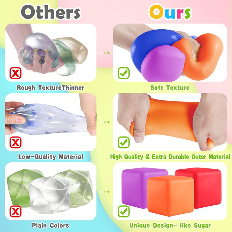 - Nontoxic Stress Relief Toys: These Squishy Stress cubes are made of thick thermoplastic rubber (TPR) outer layer and filled with sugar ball gel which is super fun to squeeze, these are highly sturdy and will last numerous squishies. There are no harmful chemicals added. It's 100% non-toxic, BPA free, and odorless.If dust sticks to the ball, rinse it with water and it's instantly as clean as new.