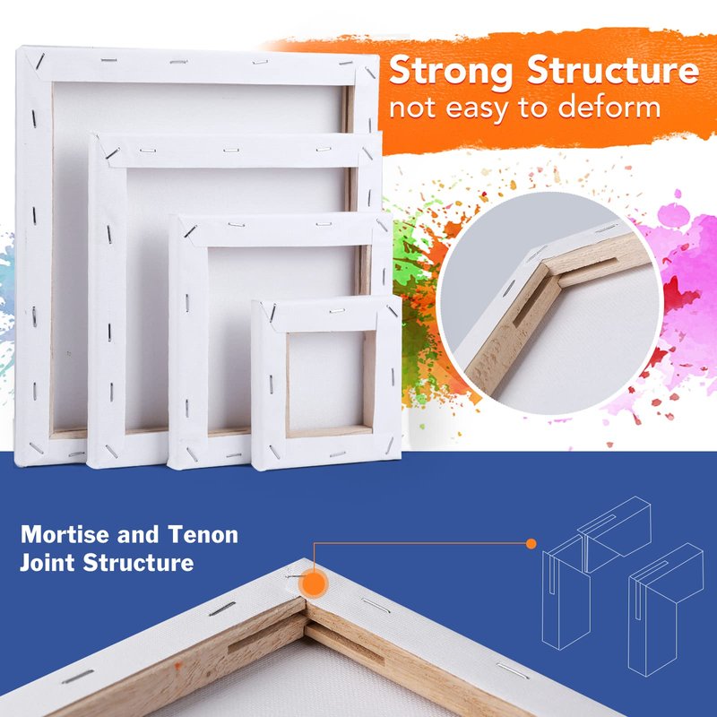 - Wood Frame: Stretched canvases for painting are made of pinewood, light weight and high strength, easy to paint, carry and display. The joint is connected by mortise and tenon structure, glue-free and no odor, solid and strong. The art canvas is nailed firmly to the wooden frame, giving the flat canvas boards good stretch and an extraordinary art experience.