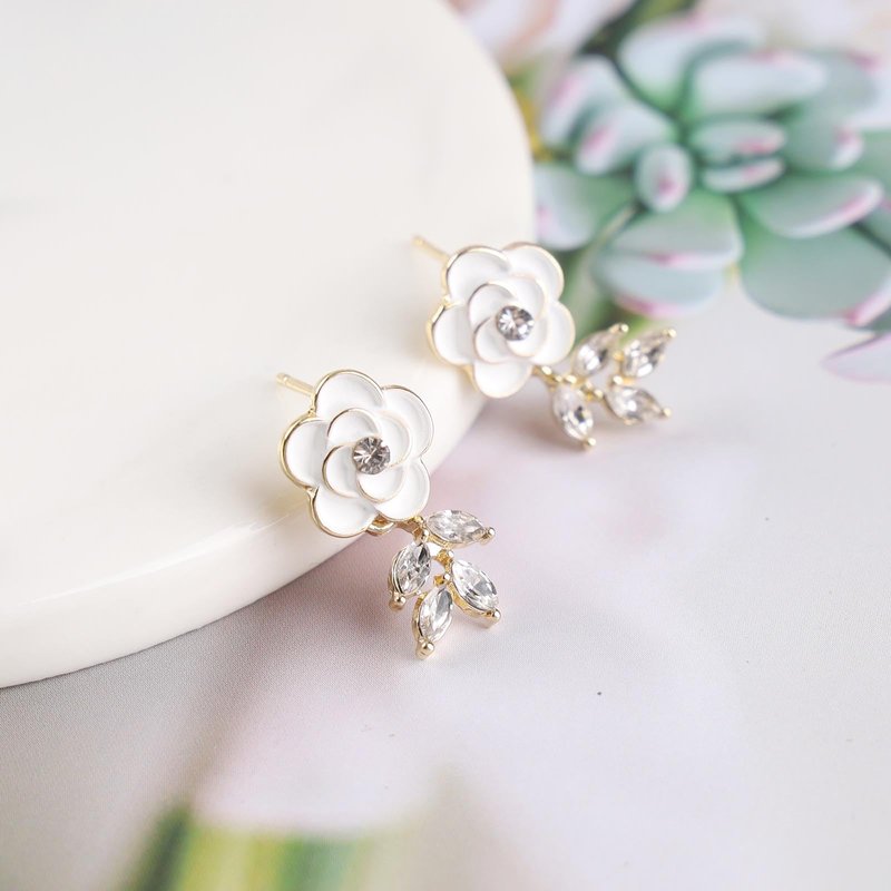 Sttiafay Vintage Crystal Flower Earrings Rhinestone Leaf Drop Earrings White Camellia Stud Earring Gold Cz Flower Bridal Earrings Jewelry for Women