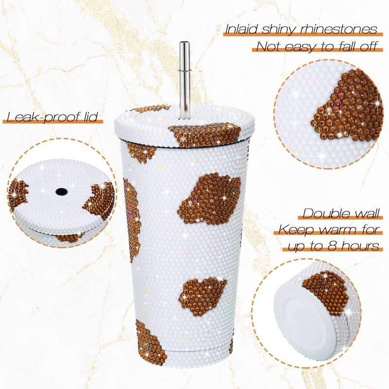 Studded Bling Diamond Tumbler Glitter Water Bottle with Lid Stainless Steel Vacuum Thermal Straw Tumbler Rhinestone Tumbler with 1 Pcs Cup Brush 6 Pcs Straw Brushes for Women (16.9 oz, Cow)