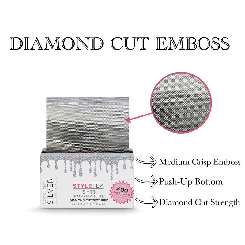 The STYLETEK 400 Series intoruduces a thick and luxurious Diamond-Cut Emboss. The foil is made from a strong and durable alluminum, yet folds like butter in the hair coloring process. The intricate embossing of small interwoven diamonds help the application of color and have been seen to speed up processing time. The item is packed with 400 Sheets and is produced with a generous top fold that will help you get close to the scapl as the pin tail comb is often used! What are you waiting for...try it out and you'll never go back to a generatic foil again!