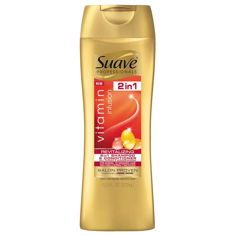 - Suave Professionals Vitamin Infusion 2in1 shampoo and conditioner boosts shine in tired, stressed hair^Strengthens weak hair^Luxurious, long-lasting fragrance^Infused with Vitamin E, C and B5^Repairs stressed hair, boosting its strength and vibrancy for healthy looking hair every day