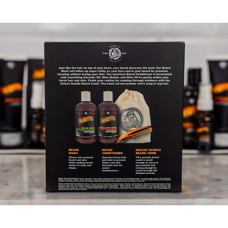 Suavecito Beard Wash Kit Men's Grooming & Cleansing Avocado Oil Shea Butter Olive Oil Nourishing Wash, Conditioner, Comb, Travel Bag